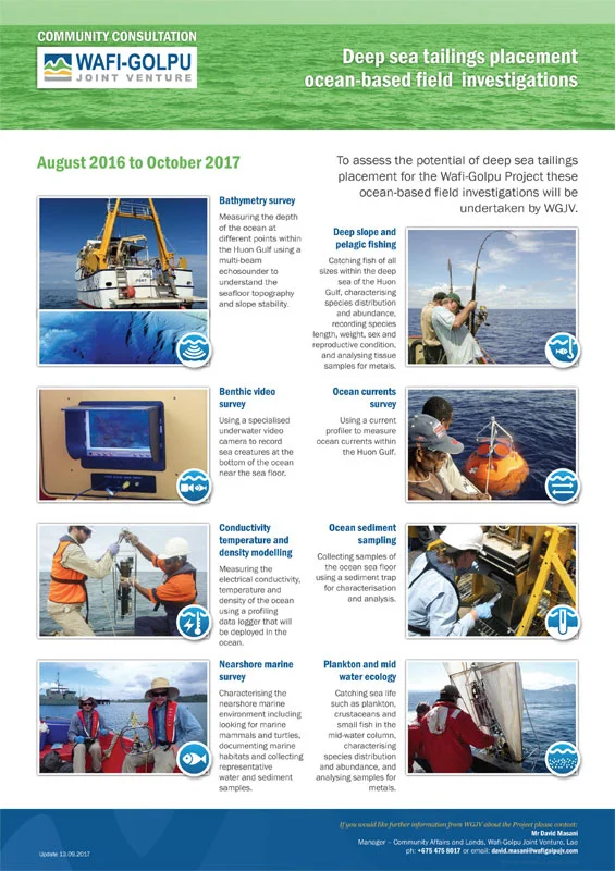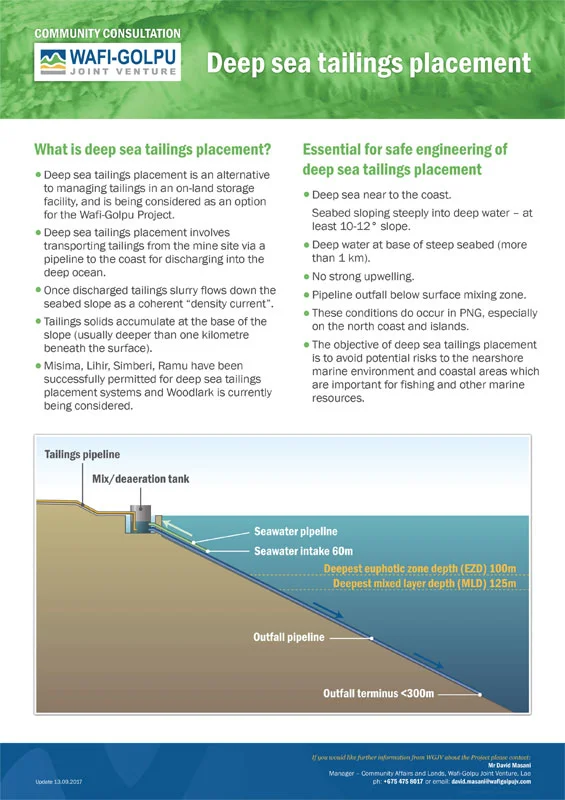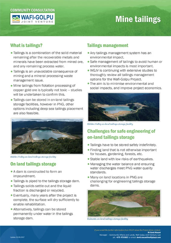 This video in Tok Pisin represents information on the WGJV's evaluation of tailings management options for the Wafi-Golpu Project.